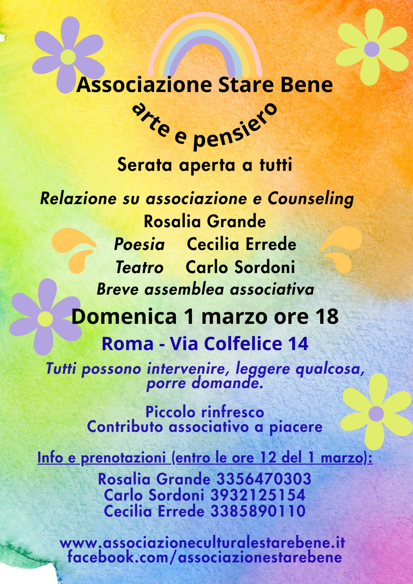 1 marzo ore 18 incontro "Arte e pensiero" Poesia,teatro,counseling e altro.Assemblea associativa. Via Colfelice,14